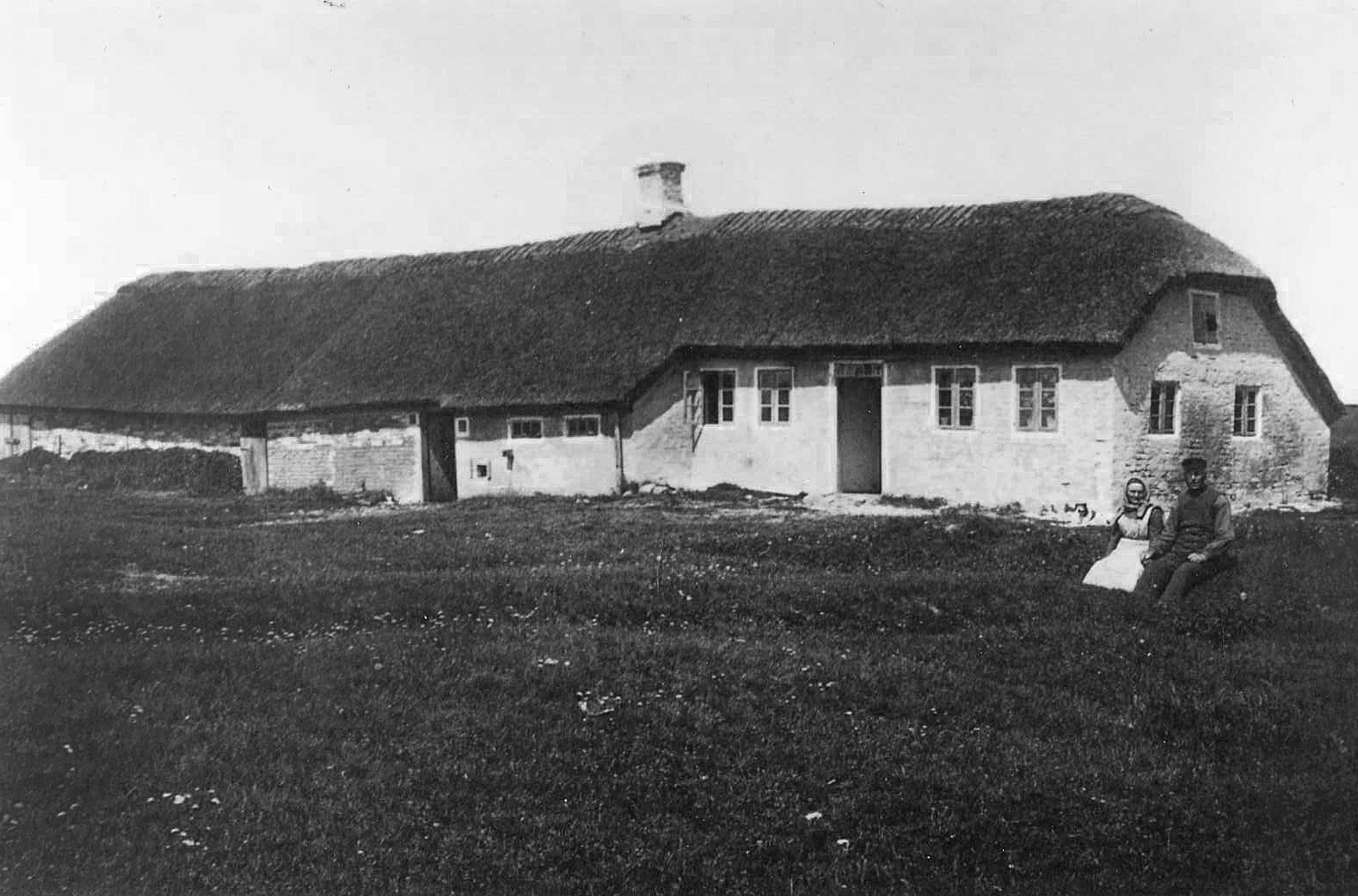 Bjarkes tipoldefar Niels Nicolaj og hustru foran deres hus med stråtag.